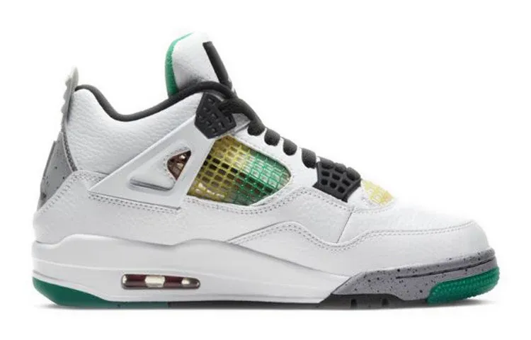 Produced in women's sizing, this Air Jordan 4 takes elements of the iconic White Cement colorway, featuring white tumbled leather upper with rasta colors across the netting.